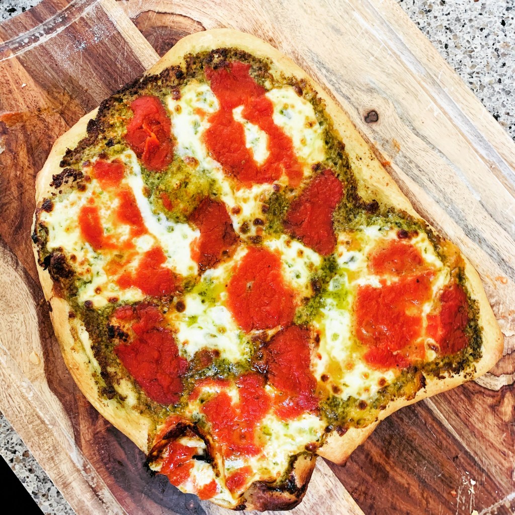 Connecticut is very well known for it’s amazing choice of pizza and having tested multiple options in restaurants…it’s true!!!! Pizza here is amazing!! In our current state of affairs, aka the pandemic, we have been staying home a lot more and pizza is one thing we can make as family … even my 3.5yo can participate! Today, I chose to showcase a pizza that I made recently that has a pesto base…which I have never personally seen on a menu! For the pesto recipe, check out my post from 7/21/2020! Tip – if you want the dough for dinner, start making it early in the afternoon because it needs to rise for a few hours to be lighter (making it a day or two before is even better….but I’m a working mom and don’t always have time to plan….and sometimes even the plan doesn’t work out!!!). For you busy folks, it still works fine if you make it and just let it rise 30 minutes before putting it in the oven (I tested this!)